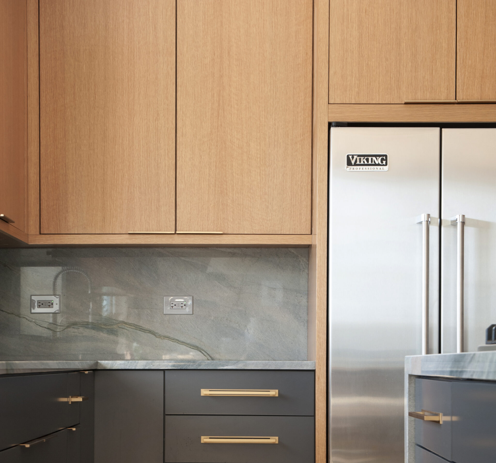 The kitchen features a sleek design characterized by clean lines and a harmonious blend of natural wood and rich stone finishes. The cabinetry, crafted from warm-toned wood, provides ample storage while adding a touch of natural warmth to the space. This wood finish contrasts beautifully with the deep, moody tones of the lower cabinetry, creating a dynamic yet balanced look.